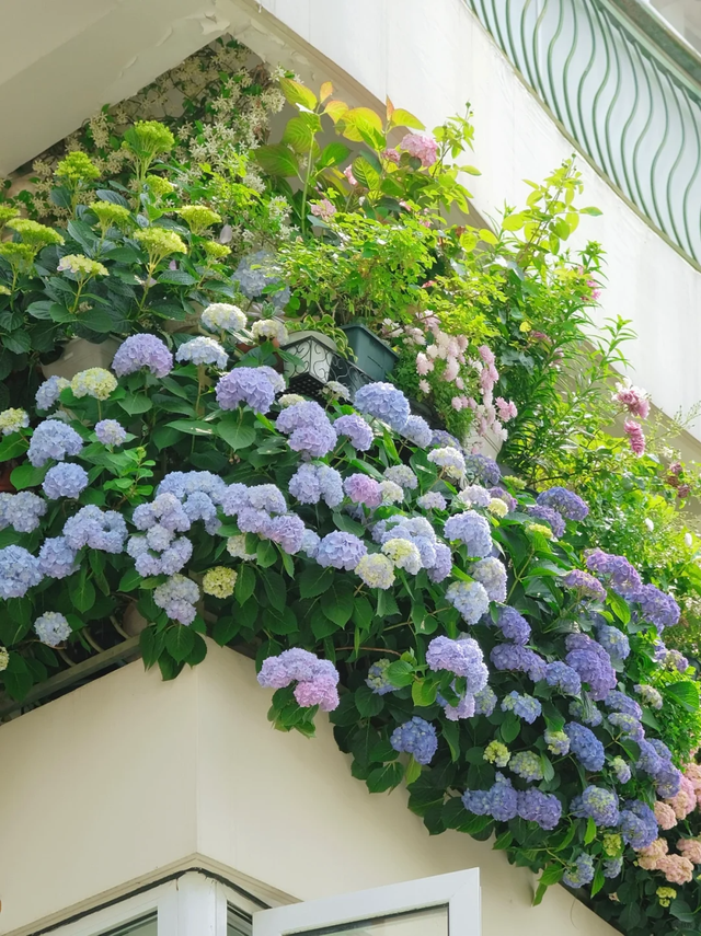 月季、绣球 盛开时,阳台就是迷你花园,疲惫时看一眼,心情立刻明亮起来。